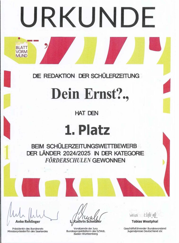 Unsere Zeitung hat in der Kategorie „Förderschulen“ den 1. Platz belegt und damit ein Preisgeld von 1000 € gewonnen!